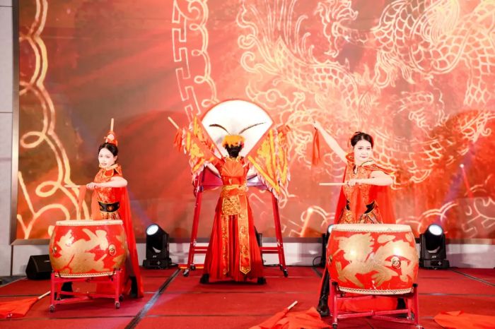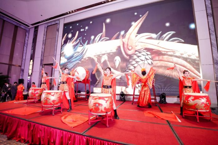 年會在激昂的鼓聲中拉開帷幕。鼓手們揮舞鼓槌,密集的鼓點如暴風(fēng)驟雨傾瀉而下,磅礴氣勢瞬間抓住眾人目光,點燃現(xiàn)場熱烈氛圍。緊接著,歡騰舞獅隆重登場,瑞獅靈動活潑,時而昂首擺尾,時而上下翻騰,將祥瑞與歡樂傳遞給現(xiàn)場每一位朋友。